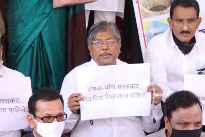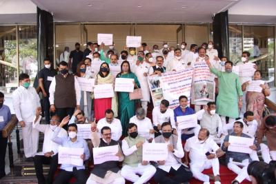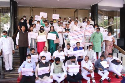 भाजपा नेत्यांनी विरोधी पक्षनेते देवेंद्र फडणवीस आणि प्रदेशाध्यक्ष चंद्रकांत पाटील यांच्या नेतृत्वात महाविकास आघाडी सरकारविरुद्ध ठिय्या केला. यावेळी, फलकबाजीही करण्यात आली.