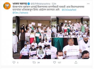 शेतकऱ्यांना नुकसान भरपाई मिळण्याच्या मागणीसाठी यासाठी आज विधानभवनाच्या पायऱ्यांवर भाजपाकडून ठिय्या आंदोलन करण्यात आले.