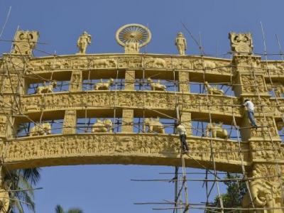 दादरमधल्या चैत्यभूमीच्या कमानीची साफसफाई होताना.