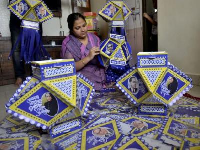 बाबासाहेबांच्या चित्राचा समावेश असलेले आकाश कंदील.