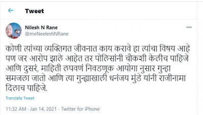 निलेश राणे म्हणाले ट्विट करत म्हणाले की, कोणी त्यांच्या व्यक्तिगत जीवनात काय करावे हा त्यांचा विषय आहे. पण जर आरोप झाले आहेत तर पोलिसांनी चौकशी केलीच पाहिजे. तसेच दुसरं, माहिती लपवणं निवडणूक आयोगानुसार गुन्हा समजला जातो आणि त्या गुन्ह्याखाली धनंजय मुंडे यांनी राजीनामा दिलाच पाहिजे, अशी मागणी निलेश राणे यांनी केली आहे.
