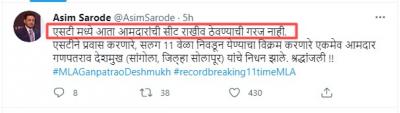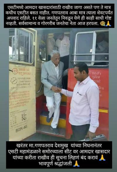 गणपत आबा गेले, आता एसटी बसमध्ये आमदारांसाठी राखीव असलेली जागा बंद केली तरी चालेल, अशा आशयाचा मेसेज व्हायरल होत आहे. आबा हेच एसटीने प्रवास करणारे शेवटचे आमदार असल्याचं दिसून येतंय.