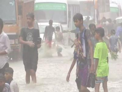 रस्त्यावर साचलेल्या पाण्यात बच्चेकंपनी खेळण्याचा आनंद लुटत आहेत.