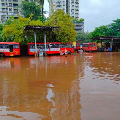 तसेच ठाणे राज्य परिवहन महामंडळाच्या ठाणे आगार क्रमांक २ खोपट येथील बस आगारात मोठ्या प्रमाणात पाणी साचून तलावाचे स्वरूप प्राप्त झाले आहे.