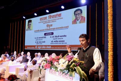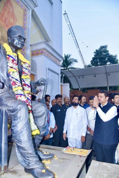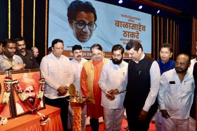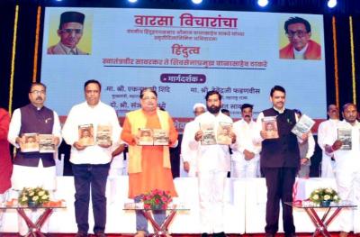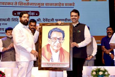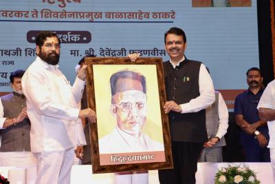 या कार्यक्रमाला राज्याचे मुख्यमंत्री एकनाथ शिंदे आणि उपमुख्यमंत्री देवेंद्र फडणवीस यांच्यासह अनेक मंत्री, आमदार, खासदार उपस्थित होते. यावेळी, हिंदुह्रदयसम्राट म्हणून स्वातंत्र्यवीर सावकर यांचाही फोटो दोन्ही नेत्यांनी दाखवला.