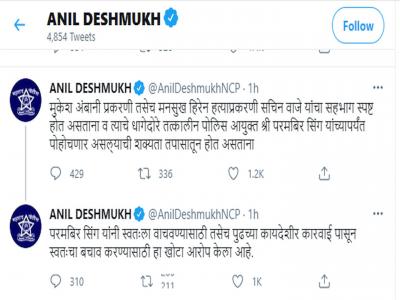 मुकेश अंबानी प्रकरणी तसेच मनसुख हिरेन हत्याप्रकरणी सचिन वाझे यांचा सहभाग स्पष्ट होत असताना आणि त्याचे धागेदोरे तत्कालीन पोलिस आयुक्त श्री परमबीर सिंग यांच्यापर्यंत पोहोचणार असल्याची शक्यता तपासातून होत असताना, परमबीर सिंग यांनी स्वतःला वाचवण्यासाठी तसेच पुढच्या कायदेशीर कारवाईपासून स्वतःचा बचाव करण्यासाठी हा खोटा आरोप केला आहे, असं ट्विट अनिल देशमुख यांनी केलं.