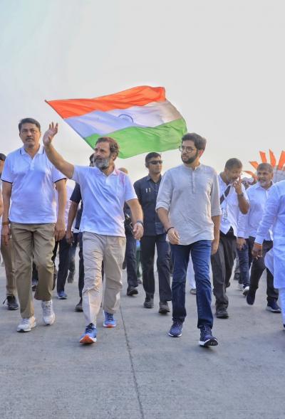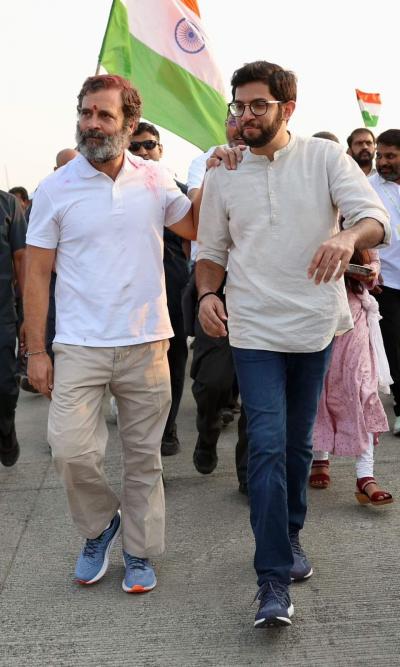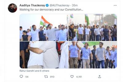 आदित्य यांनी यात्रेतील सहभागाचे फोटो सोशल मीडियावरुन शेअर केले आहेत. तसेच, walking for democracy and constitution... असे कॅप्शन आदित्य ठाकरेंनी या फोटोंसह लिहिले आहे.