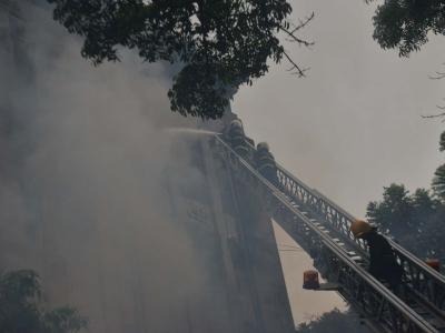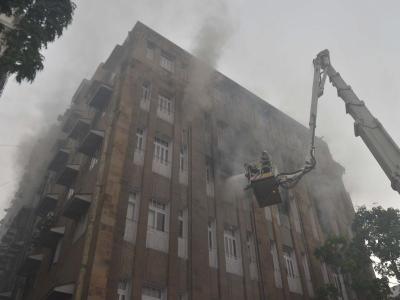 फोर्ट येथील बलार्ड इस्टेटमधील सिंधिया हाऊस या सहा मजली इमारतीच्या तिस-या आणि चौथ्या मजल्यावर शुक्रवारी सायंकाळी पावणे पाच वाजण्याच्या सुमारास आग लागली. (सर्व छाया- सुशील कदम)