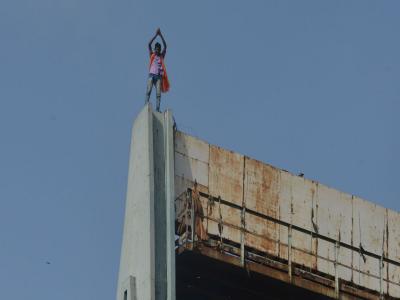 या दोन्ही नेत्यांवर प्रेम करणारा श्याम गायकवाड हा कार्यकर्ता चक्क दादर टीटीच्या पुलावर चढून घोषणा देत होता. (छाया- सुशील कदम)