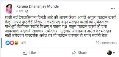 करुणा मुंडे यांनी फेसबुक पोस्टद्वारे नागरिकांना आवाहनही केलं आहे. माझी सर्व देशवासियांना विनंती आहे की, आपण जेव्हा आपले अमूल्य मतदान करतो तेव्हा आपण कुठलेही विचार न करता पक्ष बघून मतदान करतो. त्या उमेदवारचा पार्श्वभूमी क्रिमिनल रेकॉर्ड शिक्षण न पाहता पक्ष पाहून मतदान करतो ही प्रथा आपल्याला बदलावी लागणार. उमेदवार गुन्हेगार अंगठाबाज असेल तर मतदान नाही उमेदवार पारदर्शक असेल तर मी मतदान करणार ही शपथ सर्वानी घेऊ, असं फेसबुक पोस्टद्वारे करुणाने म्हटलं आहे.