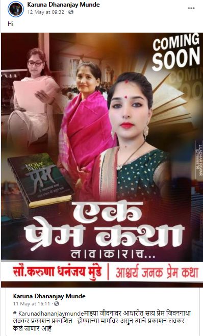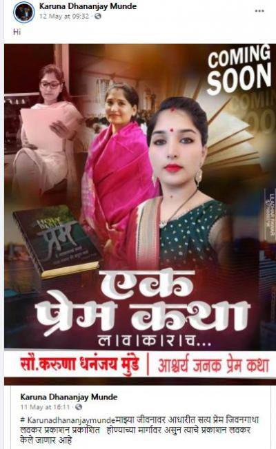 करुणा धनंजय मुंडे या नावाने फेसबुक अकाऊंट असलेल्या पेज वरून त्यांच्यातील प्रेम कथेचे रहस्य उलगडणार असल्याचे सांगितले गेले आहे. सोबतच एक फोटोही जोडण्यात आला आहे. तसेच माझ्या जीवनावर आधारीत सत्य प्रेम जिवनगाथा लवकर प्रकाशन प्रकाशित होण्याच्या मार्गावर असुन त्याचे प्रकाशन लवकर केले जाणार आहे, असं करुणा मुंडे यांनी म्हटलं आहे.