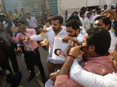 मनसे कार्यकर्त्यांनी केलेल्या हल्ल्याच्या निषेधार्थ युवक काँग्रेसच्या कार्यकर्त्यांनी मनसे अध्यक्ष राज ठाकरे यांचे छायाचित्र जाळून निषेध केला. (छायाचित्र - चेतन ननावरे)