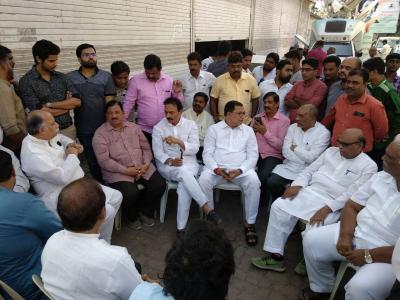 माजी खासदार गुरूदास कामत, कृपाशंकर सिंह, भाई जगताप यांच्यासह मोठ्या संख्येने काँग्रेस कार्यकर्ते काँग्रेसच्या कार्यालयाबाहेर एकवटले होते. (छायाचित्र - चेतन ननावरे)