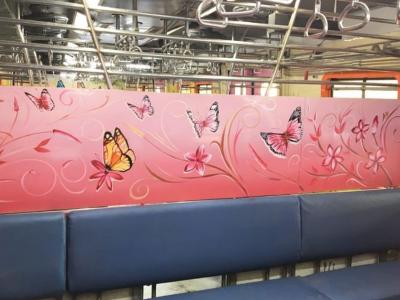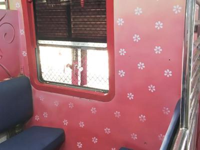 लोकलच्या डब्याला आतून एक वेगळाच नवीन लूक देण्यात आला असून गुलाबी, हिरव्या रंगाचा वापर करून फुलपाखरं, फुलं यासारखी चित्रे रेखाटण्यात आली आहेत.