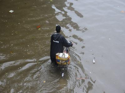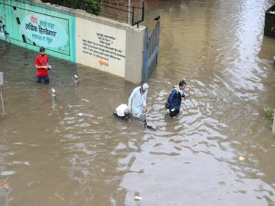 शहरातील जीटीएस नगरमध्येही मोठ्या प्रमाणात पाणी साचले आहे. या पाण्यातूनच तरुणांना सायकल घेऊन जावं लागत आहे.