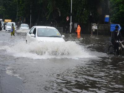 शहरातील षणमुखानंद हॉल मार्गावर साचलेल्या गुडघाभर पाण्यातून कार घेऊन जाताना नागरिक.