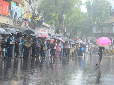भर पावसामध्ये बसची वाटत पाहत असलेले नागरिक.
