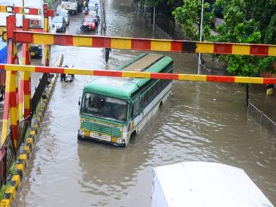 शहरातील सखल भागांमध्ये मोठ्या प्रमाणावर पाणी साचले आहे. याच पाण्यातन बसला मार्ग काढावा लागतोय.