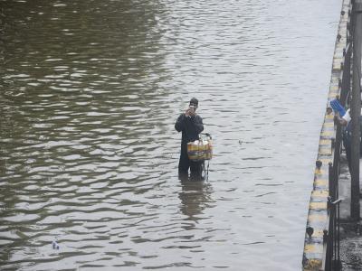 भर पावसात सायकलवरुन सामान घेऊन जाताना नागरिक.