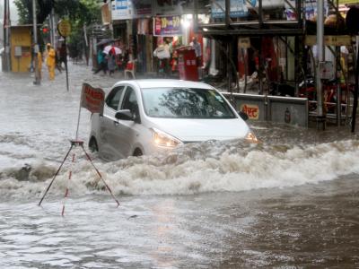 हिंदमाता चौकात नेहमीप्रमाणे गुडघाभर पाणी साचले होते.