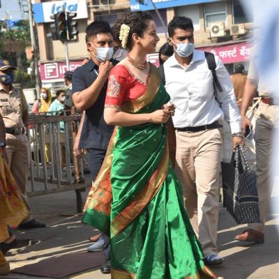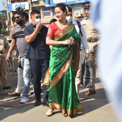 कंगनाने हिरव्या रंगाची पैठणी साडी परिधान केली होती. पारंपारिक साडी कंगनानं मॉर्डन पद्धतीनं नेसली होती.
