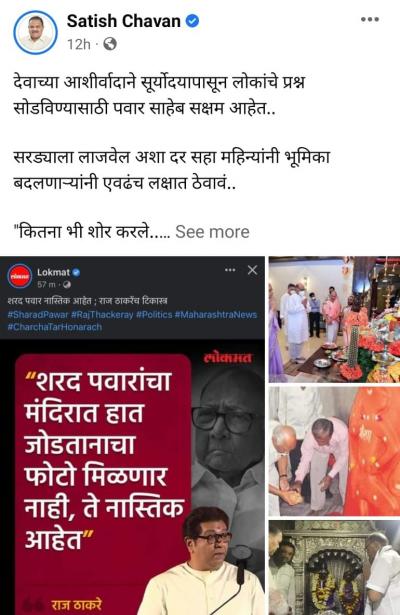 राष्ट्रवादी पदवीधर मतदारसंघाचे आमदार सतिश चव्हाण यांनीही शरद पवारांचे मंदिरातील फोटो शेअर केले आहेत. देवाच्या आशीर्वादाने सुर्योदयापासून लोकांचे प्रश्न सोडविण्यासाठी शरद पवार सक्षम आहेत, असे कॅप्शनही त्यांनी लिहिलंय.