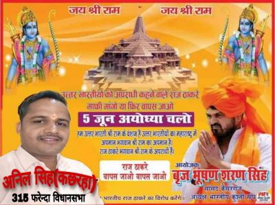 ट्विट करत ते म्हणाले, "उत्तर भारतीयांचा अपमान करणाऱ्या राज ठाकरेंना अयोध्येत पाय ठेऊ देणार नाही. राज ठाकरेंनी अयोध्येत येण्यापूर्वी हात जोडून तमाम उत्तर भारतीयांची माफी मागावी."