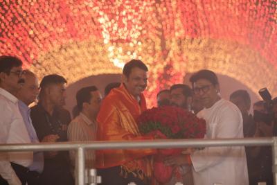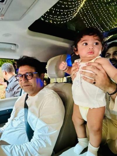 एका छायाचित्रात मुख्यमंत्री एकनाथ शिंदे डाव्या बाजुला, तर उपमुख्यमंत्री देवेंद्र फडणवीस हे उजव्या बाजुला दिसून येत आहेत. त्यासोबतच, राज ठाकरेंच्या हाती त्यांचा नातू किआन ठाकरे आहे. सीएम आणि डेप्युटी सीएमच्या मध्ये राज नातवाचा रुबाबदारपणा उठून दिसत आहे.