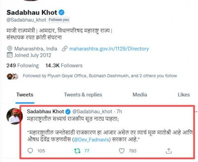 "महाराष्ट्रातील जनतेसाठी राजकारण हा आजार असेल तर त्याचं मूळ मातोश्री आहे आणि औषध देवेंद्र फडणवीस ( @Dev_Fadnavis ) सरकार आहे.", असे खोत यांनी म्हटलं.