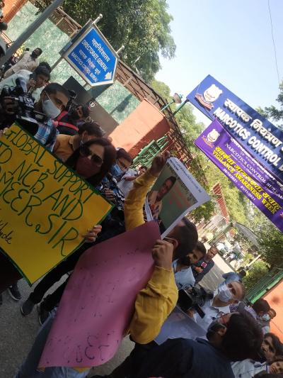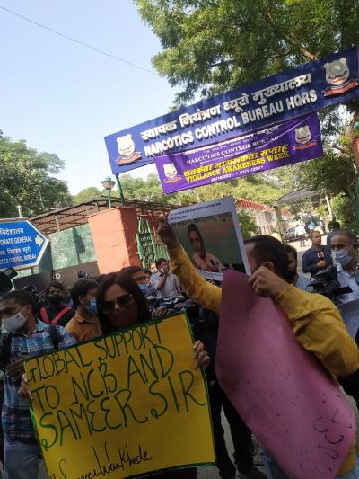 मुंबईतील एनसीबी कार्यालयाबाहेर आज शिव प्रतिष्ठान युवा हिंदुस्थान नावाच्या संघटनेनं वानखेडे यांच्या समर्थनार्थ जोरदार घोषणाबाजी केली.