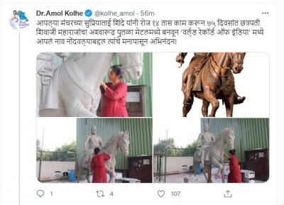 मावळ मतदारसंघाचे खासदार डॉ. अमोल कोल्हे यांनी ट्विट करुन सुप्रिया शिंदे यांनी बनविलेला शिवाजी महाराजांचा अश्वारुढ पुतळ्याचे फोटो शेअर केले आहेत. तसेच, त्यांच्या रेकॉर्डबद्दलही माहिती दिली आहे.