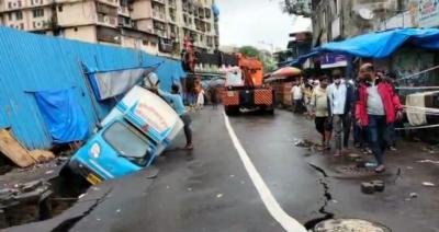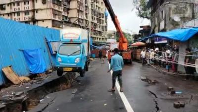मुंबईतील मुसळधार पावसामुळे शिवडी येथे रेल्वे क्रॉसजवळ रस्ता खचला आहे. रस्त्याला पडलेल्या भेगांमध्ये एक टेम्पो देखील अडकला. (फोटो: सुशील कदम)