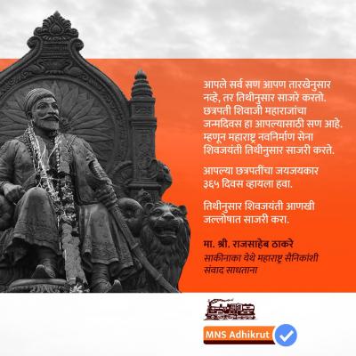 कारण छत्रपती शिवाजी महाराजांची जयंती 365 दिवस साजरी केली पाहिजे. त्यामुळेच, तिथीनं साजरी होणारी शिवजयंती ही यापेक्षाही जल्लोषात साजरी केली पाहिजे, असे राज ठाकरेंनी म्हटले.