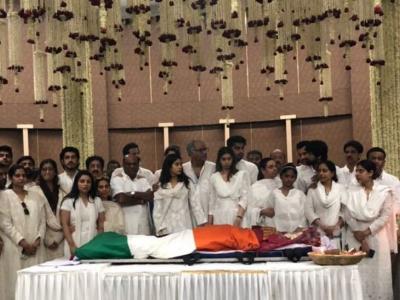 श्रीदेवीच्या तिरंग्यामध्ये लपेटलेल्या पार्थिवाशेजारी उभे असलेले कपूर कुटुंबिय.