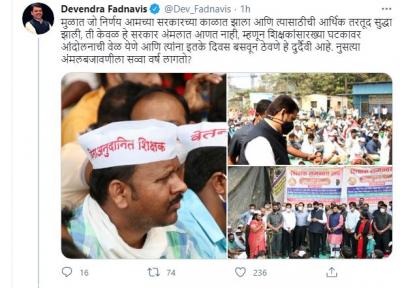 विरोधी पक्षनेते देवेंद्र फडणवीस यांनी शइक्षकांच्या मागणीकडे लक्ष देण्याचं सरकारला सूचवलं आहे