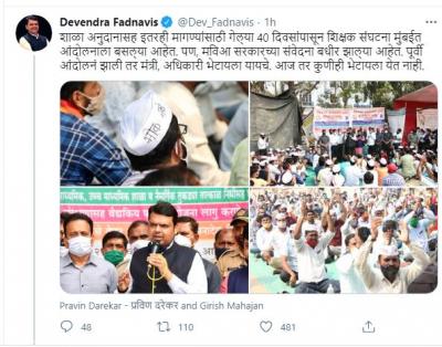 फडणवीस यांनी आपल्या सोशल मीडिया अकाऊंटवरुन या भेटीचे फोटो शेअर करत, सरकारवर निशाणा साधला आहे. सरकारने आंदोलक शिक्षकांकडे पाठ फिरवल्यानं संताप व्यक्त केला आहे.