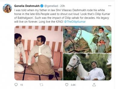 विलासराव यांच्या सूनबाई आणि अभिनेत्री जेनेलिया डिसुझा यांनी ट्विट करुन विलासराव आणि दिलीप कुमार यांच्या आठवणी जागवल्या आहेत.