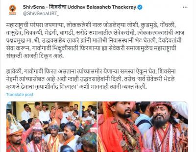 महाराष्ट्राची परंपरा जपणाऱ्या, लोककलेशी नाळ जोडलेल्या जोशी, कुडमुडे, गोंधळी, वासुदेव, चित्रकथी, मेढंगी, बागडी, सरोदे समाजातील सेवेकर व लोककलाकारांनी आज उद्धव ठाकरे यांची मातोश्री निवासस्थानी भेट घेतली.