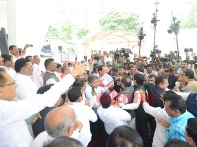 राज्याच्या पावसाळी अधिवेशनाच्या आजच्या दिवसाची सुरुवात सत्ताधारी आणि विरोधकांच्या जोरदार राड्यानं झाली आहे. ज्या विधानभवनात राज्याच्या जनतेसाठी कायदे आणि निर्णय घेतले जातात त्याच विधानभवनाच्या पायऱ्यांवर आज सत्ताधारी आणि विरोधकांमध्ये राडा झाला. (छाया- दत्ता खेडेकर)