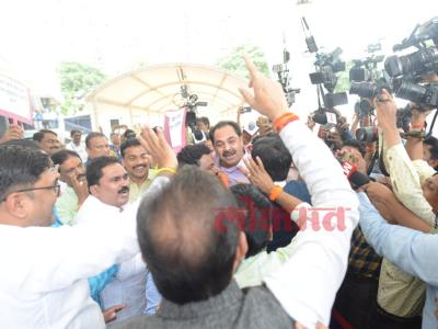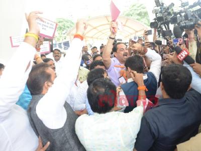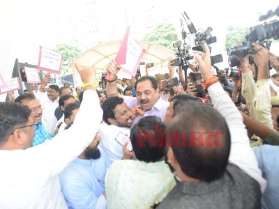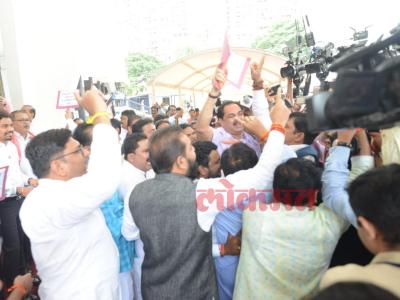 कोविड भ्रष्टाचाराच्या मुद्द्यावरुन सत्ताधारी आमदारांनी बॅनर्स झळकावले. त्याला प्रत्युत्तर देण्यासाठी रोहित पवार आणि अमोल मिटकरी यांच्या नेतृत्त्वाखालील मविआचे आमदारही त्याठिकाणी आले. (छाया- दत्ता खेडेकर)
