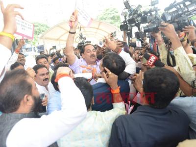 गेल्या चार दिवसांमध्ये विरोधकांनी झोंबरी घोषणाबाजी करून सत्ताधाऱ्यांना जेरीस आणले होते. त्यामुळे बुधवारी सकाळपासून भाजपचे आणि शिंदे गटाचे आमदार विधिमंडळाच्या पायऱ्यांवर आंदोलन करत होते. (छाया- दत्ता खेडेकर)