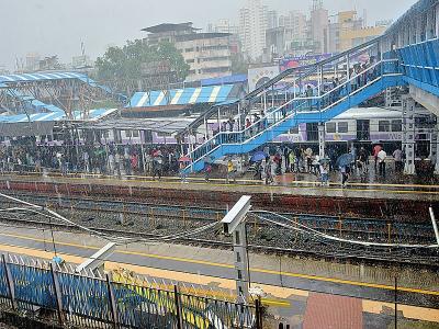 मुंबई : पश्चिम रेल्वेने डागडुजीखातर उन्हाळ्यात फलाटांवरील पत्रे काढले. त्या जागी नवे पत्रे बसविण्यात येणार होते. मात्र, मान्सून सुरू होऊनही फलाट झाकले न गेल्याने प्रवाशांना मुसळधार पावसाचा सामना करीत गाडी पकडावी लागत आहे. गर्दीच्या वेळेत पत्रे असलेल्या भागात गर्दी एकवटत असल्याने चेंगराचेंगरीची परिस्थिती निर्माण होते. मुंबईकरांचे हे हाल कॅमेऱ्यात कैद केले आहेत, ‘लोकमत’चे छायाचित्रकार दत्ता खेडेकर यांनी. (खार रेल्वे स्थानक)