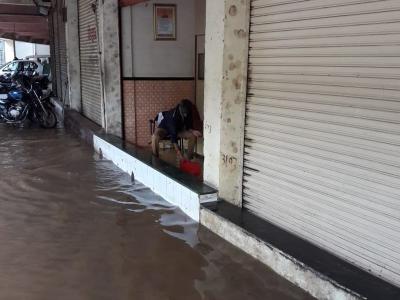 पावसाच्या पाण्याने रस्त्यावरच नाही तर दुकानातही शिरकाव केला आहे. त्यामुळे अनेकांनी आपली दुकाने बंद ठेवून पावसापासून सुटका करुन घेण्याचा प्रयत्न केला आहे. या छायाचित्रातआपल्या दुकानात शिरलेले पाणी काढताना एक दुकानदार दिसत आहे.