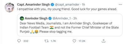 'मी अमरिंदर सिंग आहे, भारतीय फुटबॉल टीमचा गोलकीपर. पंजाबचा मुख्यमंत्री नाही. न्यूज मीडिया पत्रकारांनी मला टॅग करणे बंद करावे,' असे आवाहन केले आहे.