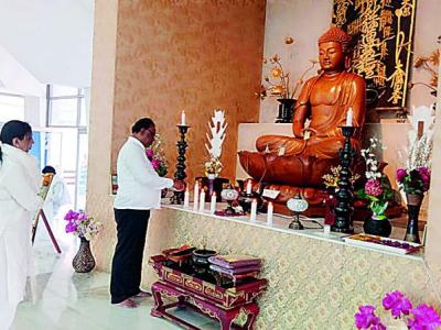 बुद्ध पोर्णिमेनिमित्त कामठी येथील ड्रॅगन पॅलेस टेम्पल येथे तथागत गौतम बुद्धाच्या प्रतिमेला अभिवादन करतांना राज्याचे ऊर्जामंत्री तथा नागपूर जिल्ह्याचे पालकमंत्री चंद्रशेखर बावनकुळे, सोबत राष्ट्रीय अल्पसंख्याक आयोगाच्या सदस्य अॅड. सुलेखा कुंभारे