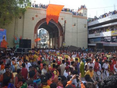 श्री शिवराज्याभिषेक सोहळा समितीतर्फे आयोजित छत्रपती शिवाजी महाराजांचा राज्याभिषेक सोहळा आटोपल्यानंतर शिवप्रेमी युवक-युवतींनी ढोल-ताशांच्या निनादात भगवा ध्वज नाचवला.
