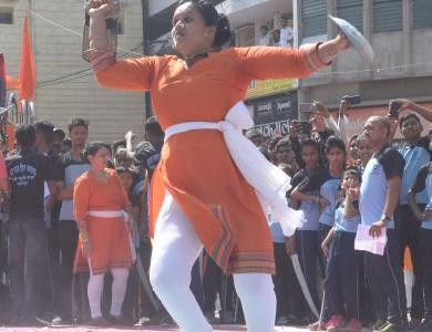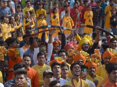छत्रपती शिवाजी महाराजांच्या राज्याभिषेक सोहळ्यात काढण्यात आलेल्या मिरवणुकीत विविध संघटना सहभागी झाल्या. यावेळी युवकांनी तलवारबाजीचे चित्तथरारक प्रात्यक्षिके सादर करून तलवार उंचावत छत्रपती शिवाजी महाराजांचा जयघोष केला. (सर्व छायाचित्रे मुकेश कुकडे यांची)
