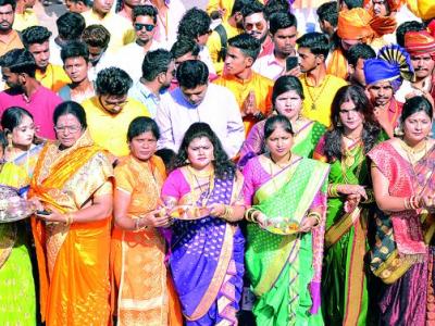 छत्रपती शिवाजी महाराज आणि जिजाऊ मातेच्या प्रतिमेसमोर आरती करताना महिला