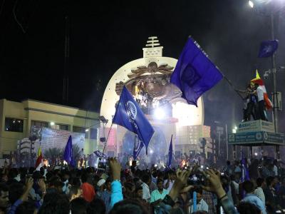 रेल्वे स्टेशन परिसरातील डॉ बाबासाहेब आंबेडकर यांच्या पुतळ्यासमोर मध्यरात्री १२ वाजता तुफान आतिषबाजी करण्यात आली (फोटो -सचिन मोहिते )