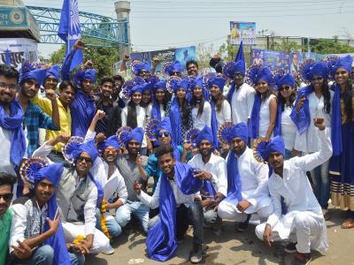 निळे फेटे व पांढरा पेहराव परिधान करत युवक -युवतींचे गटा-गटाने येत बाबासाहेबांना अभिवादन केले
